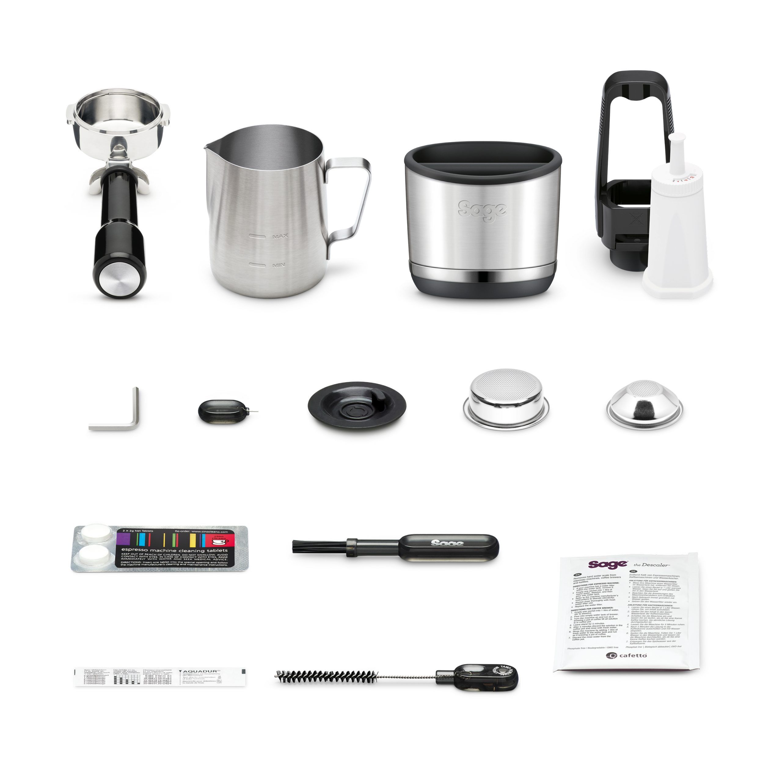 - Brosse de sortie de mouture et aimant de retrait du dameur, brosse de nettoyage, outil de nettoyage pour l’embout de la buse à vapeur, clé Allen, disque de nettoyage, pastilles de nettoyage, bandelette de test de dureté de l’eau, filtre à eau et support de filtre, poudre de détartrage